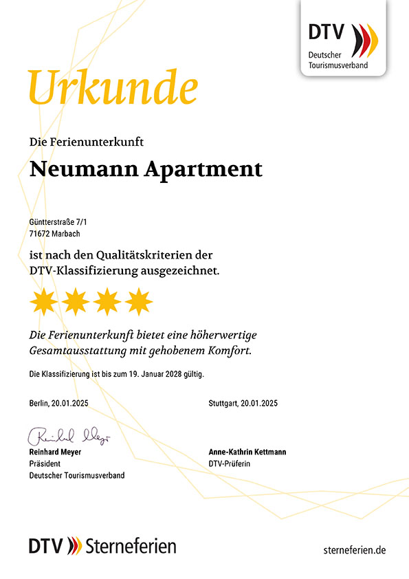 Unser Apartment ist vom DTV, dem Deutschem Tourismusverband e.V. mit 4 Sternen ausgezeichnet!